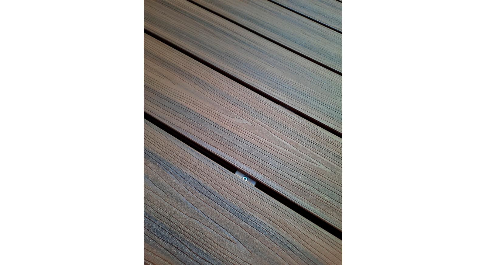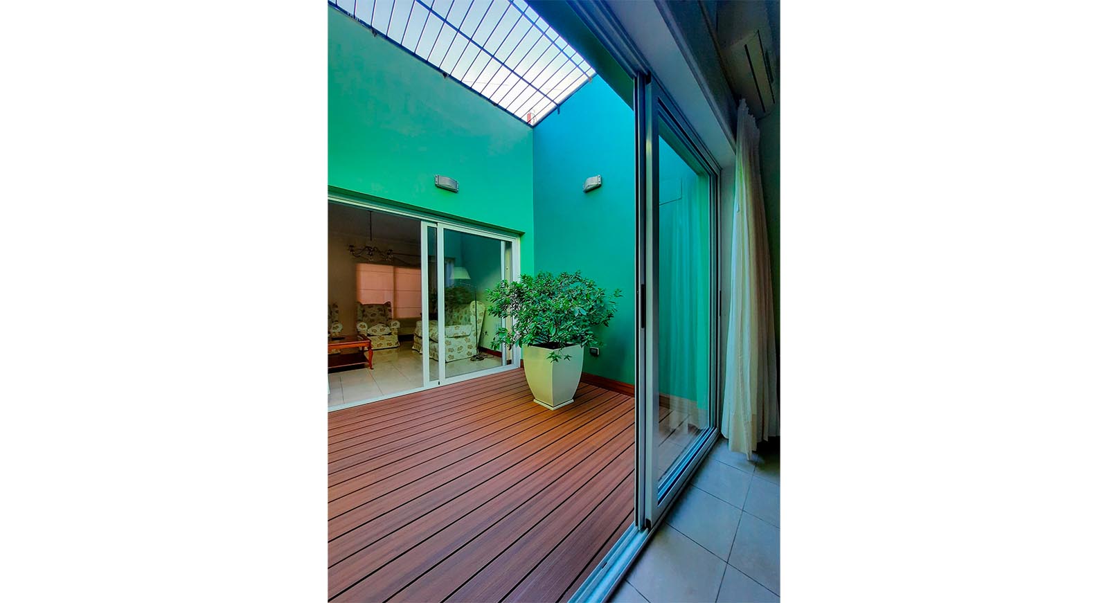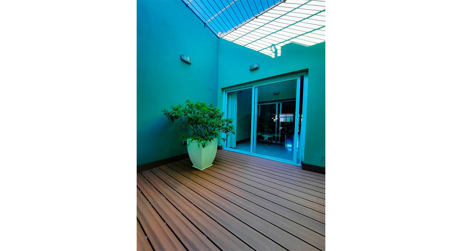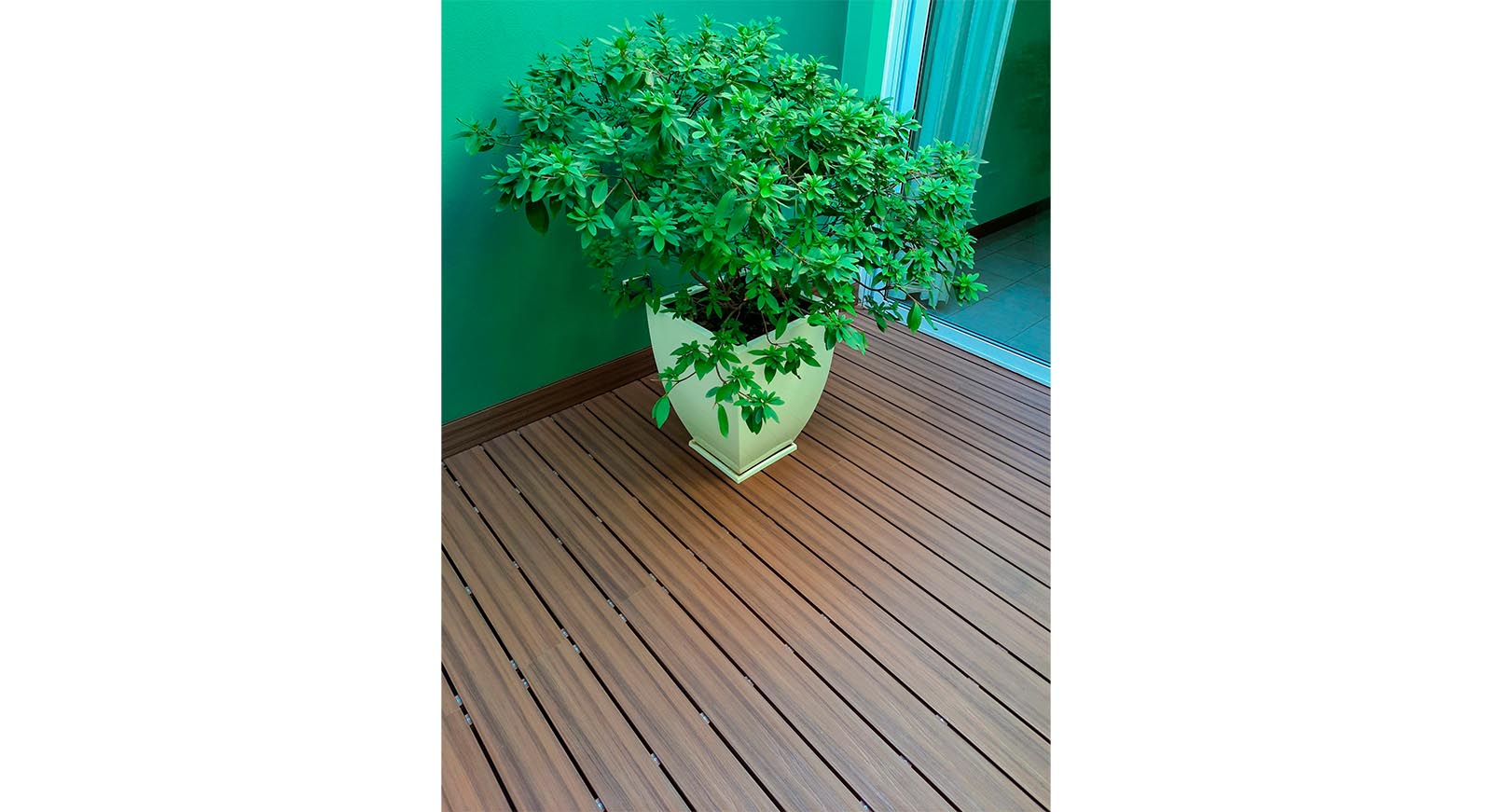 Deck de WPC cubierto con polímeros de ingeniería en sus cuatro lados. Resistente al agua, al clima extremo y decoloración. Con garantía de hasta 20 años para durabilidad excepcional.