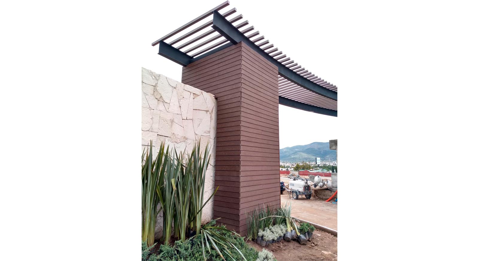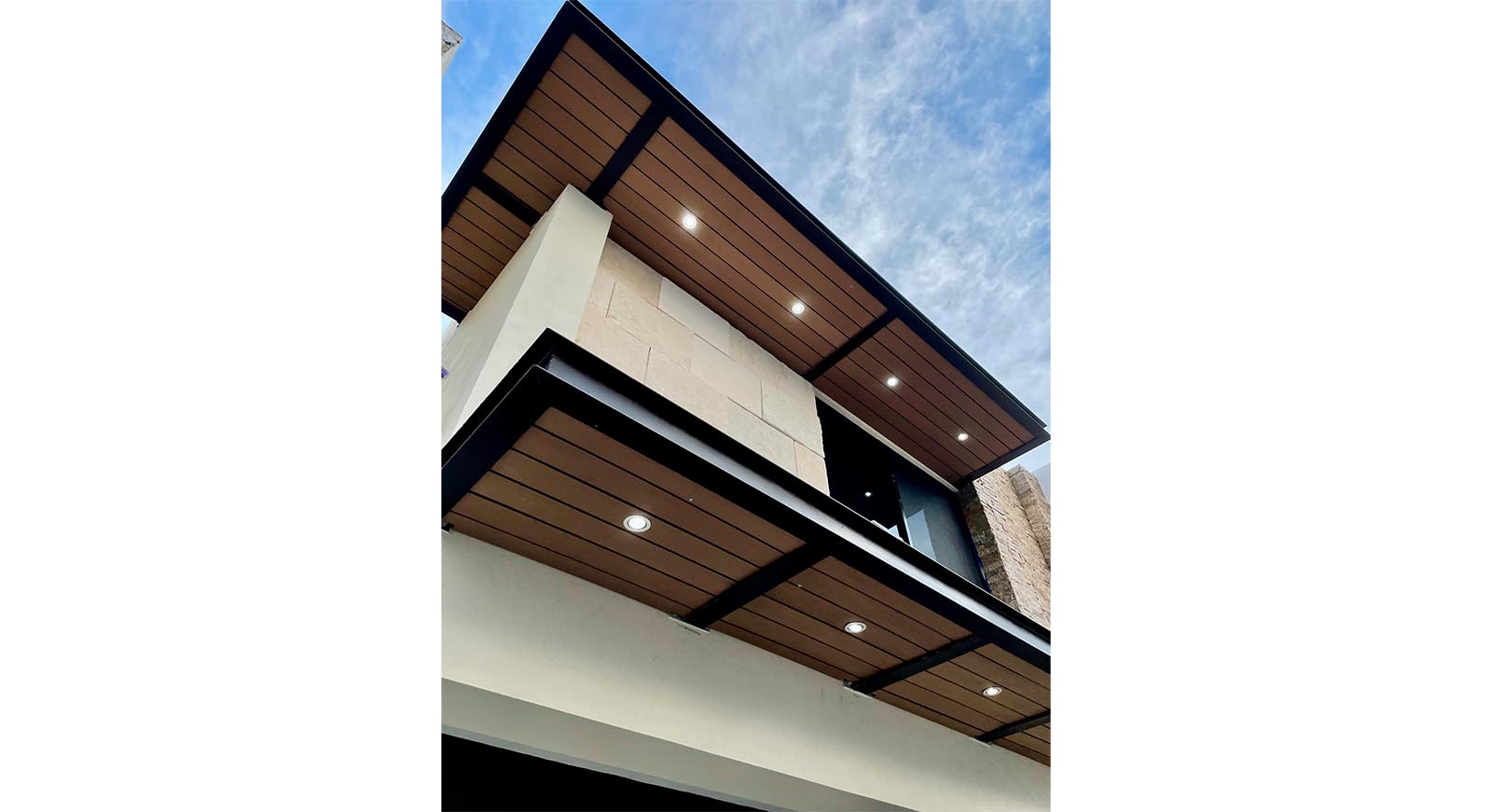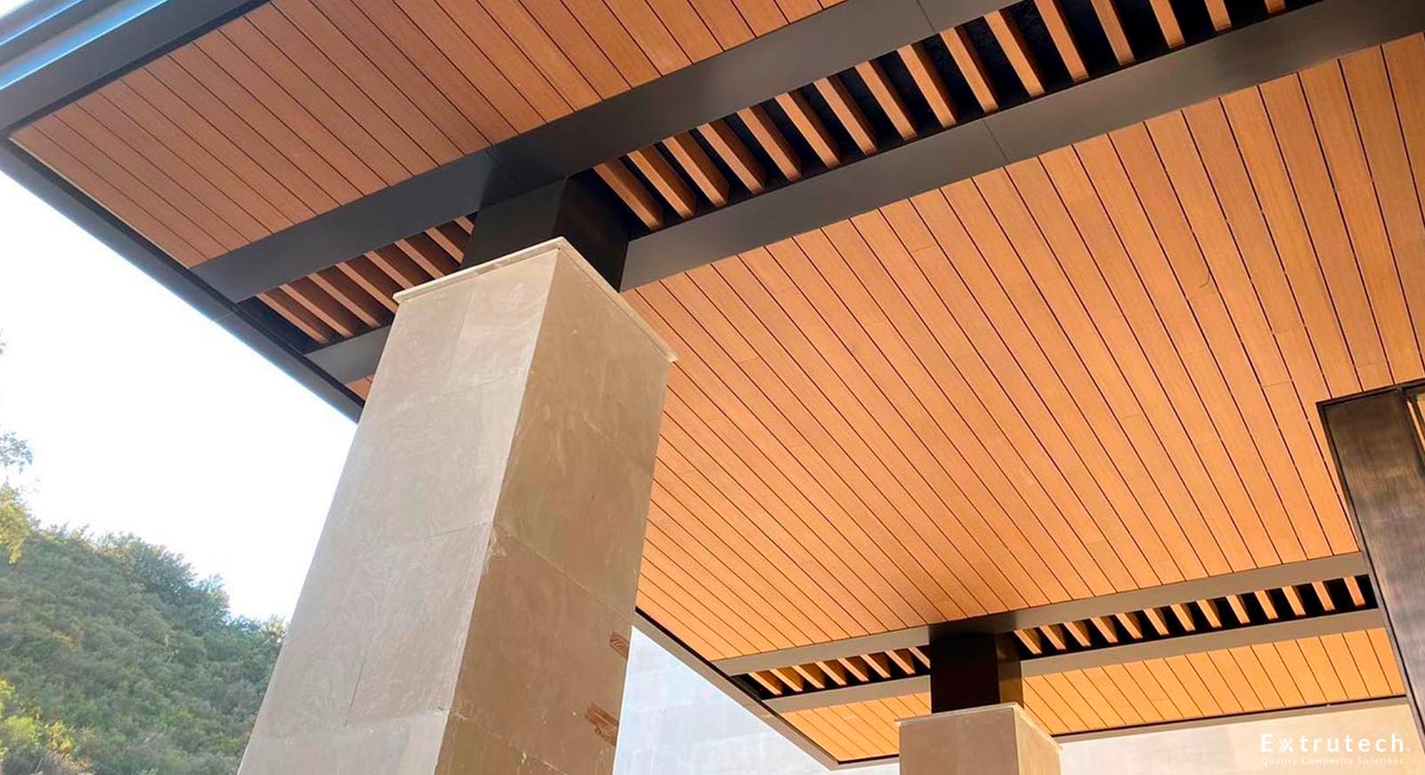 Plafón de WPC con revestimiento de polímeros de ingeniería en todos sus lados, garantizando resistencia al agua, decoloración y a condiciones climáticas extremas. Con garantía de hasta 20 años.